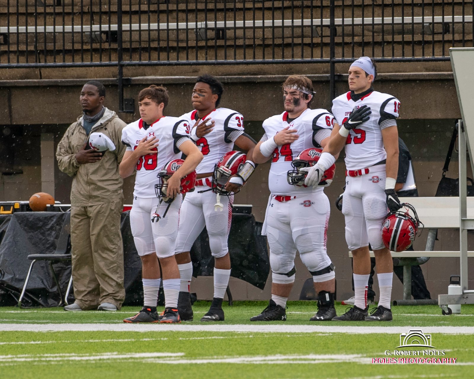 When the color guard passed and the National Anthem was played during the Opelika-Lee Game, Opelika Football Captains showed their character. Maybe some others should be leaders and show respect. Who is the example here? #opelikabulldogs